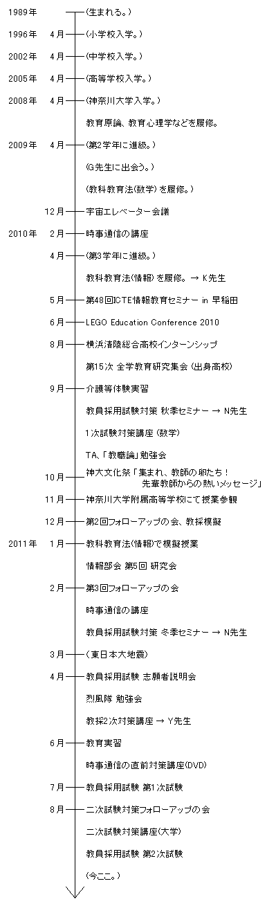 2011年08月、教員採用試験の初受験を終えた。ここまでの道のりを支えてくださった皆様には感謝でいっぱいである。ここに、教員採用試験に至るまでの道のりをまとめておきたいと思う。