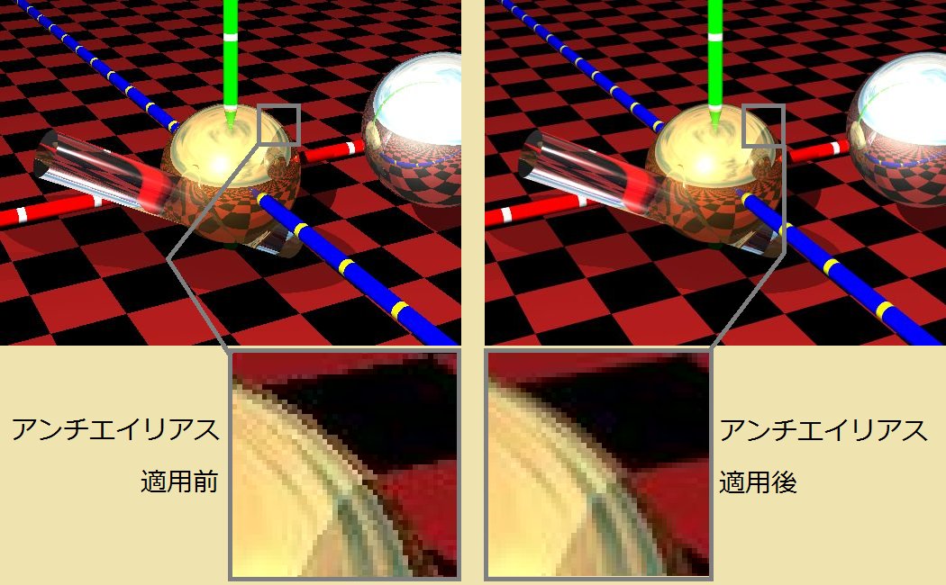 例えば、一見すると同じように見える以下の二つの画像ですが、右側は「アンチエイリアシング」という処理をしてジャギー(画像を拡大すると見えるぎざぎざ)が抑えられているのが分かります。